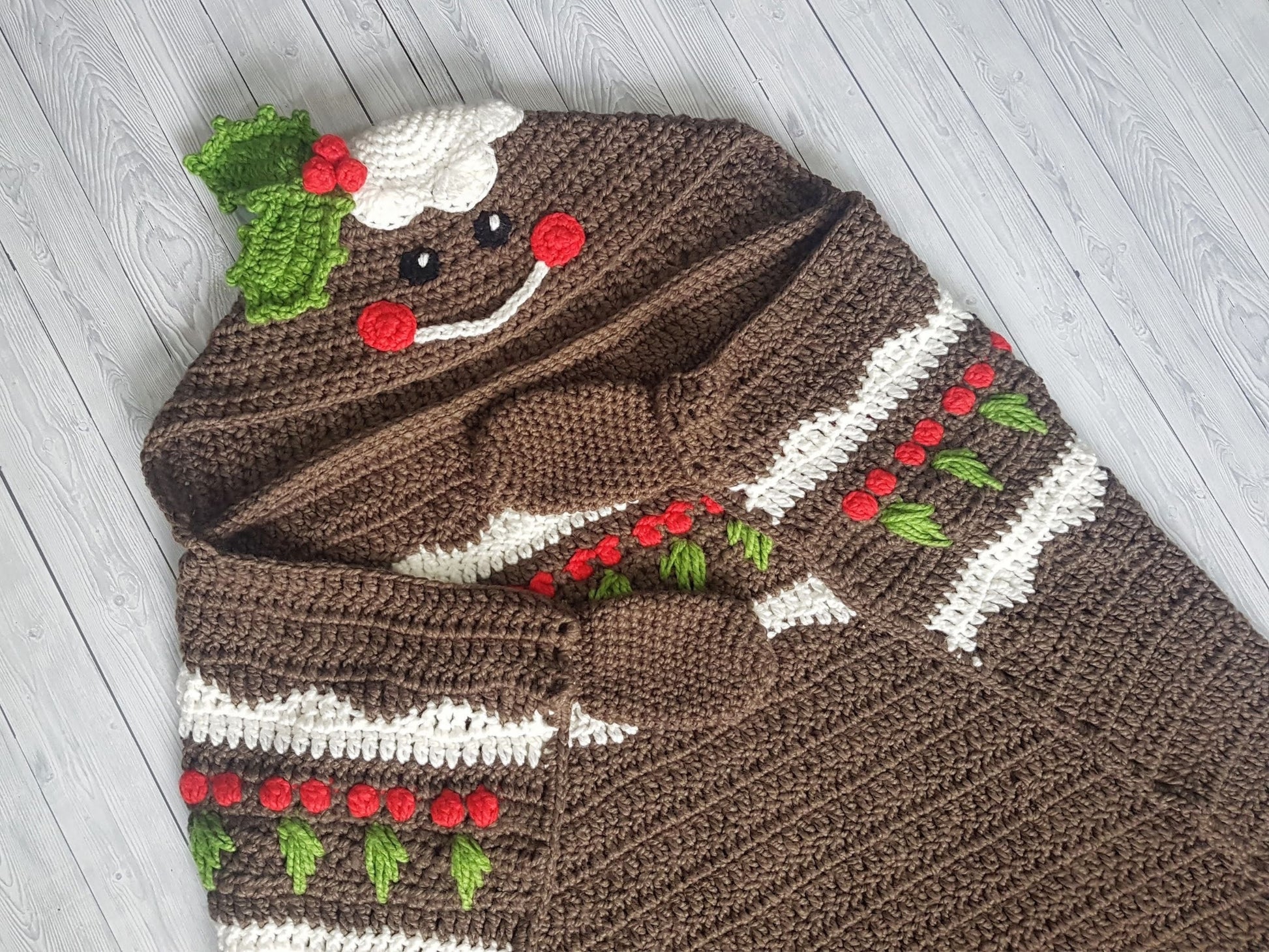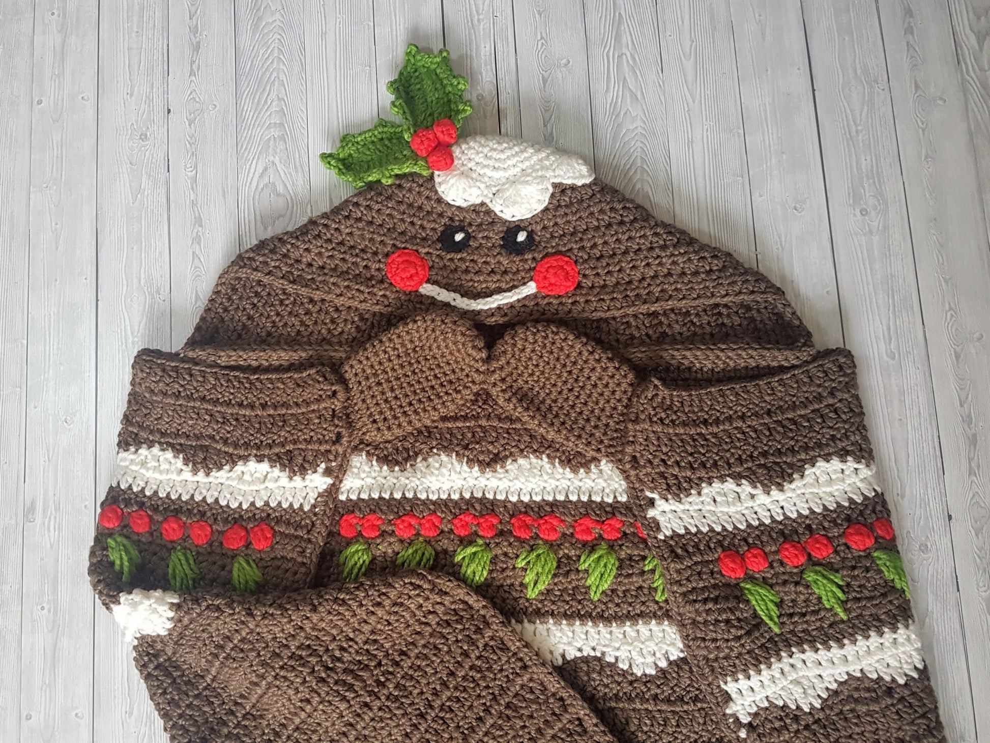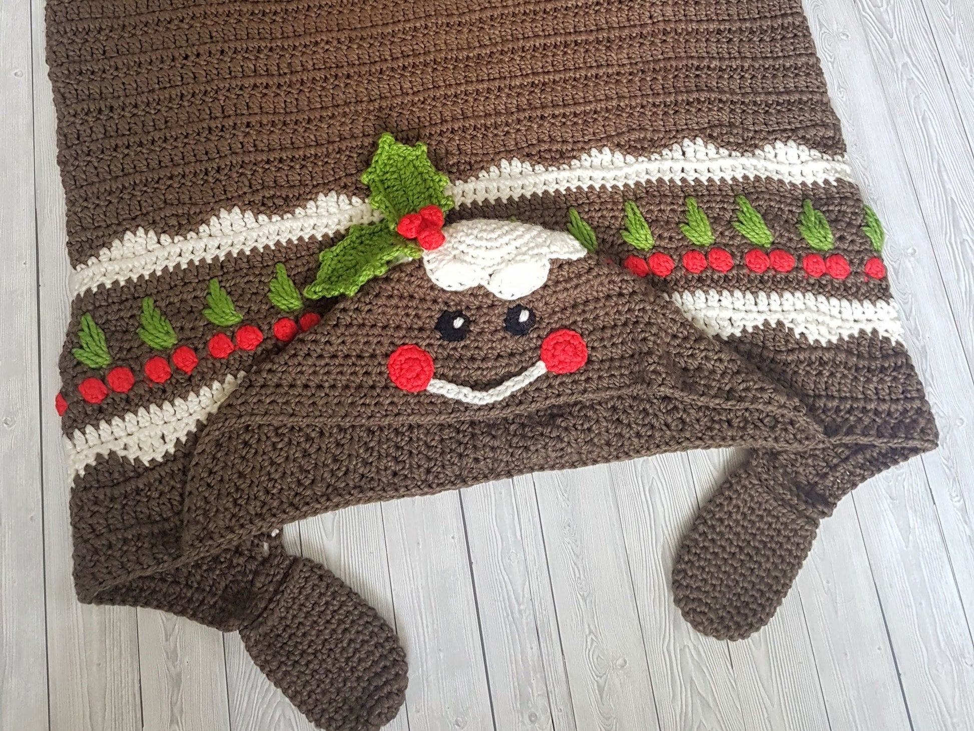 What a great idea! This festive Christmas pudding hooded blanket is also a decoration for your room. Use it to keep warm and snugly, and when you are done with it, fold it and display it on your sofa, armchair or bed. Features a decorative holly leaves and berries border and a cute holly bow on the hood. Check out my other hooded blankets in my Etsy shop.
