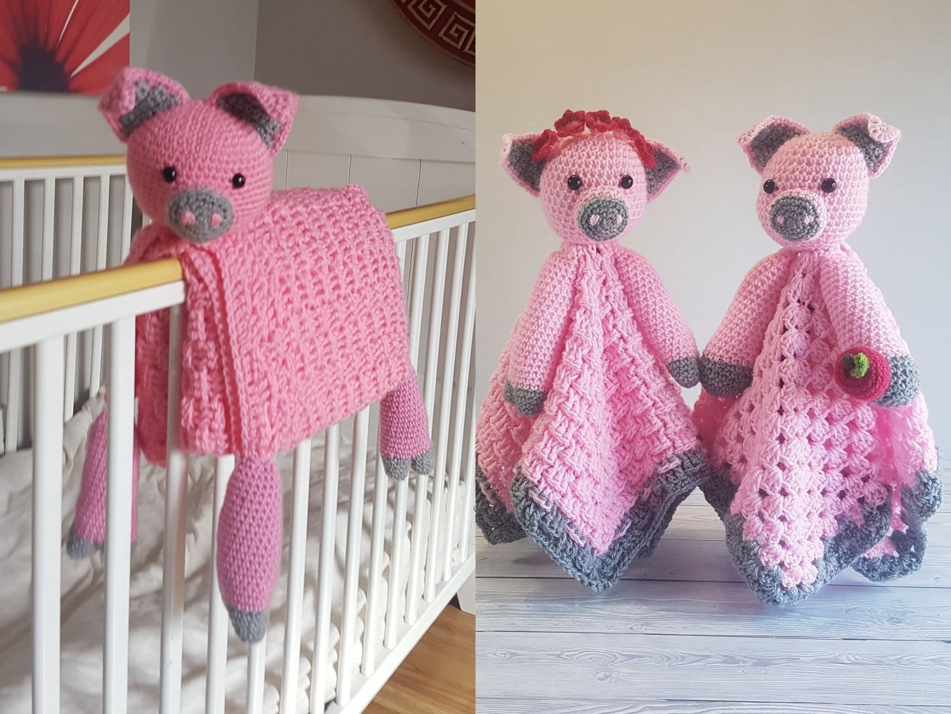 The pig lovey was designed to match the baby blanket with a similar pattern. This pattern contains 2 designs: