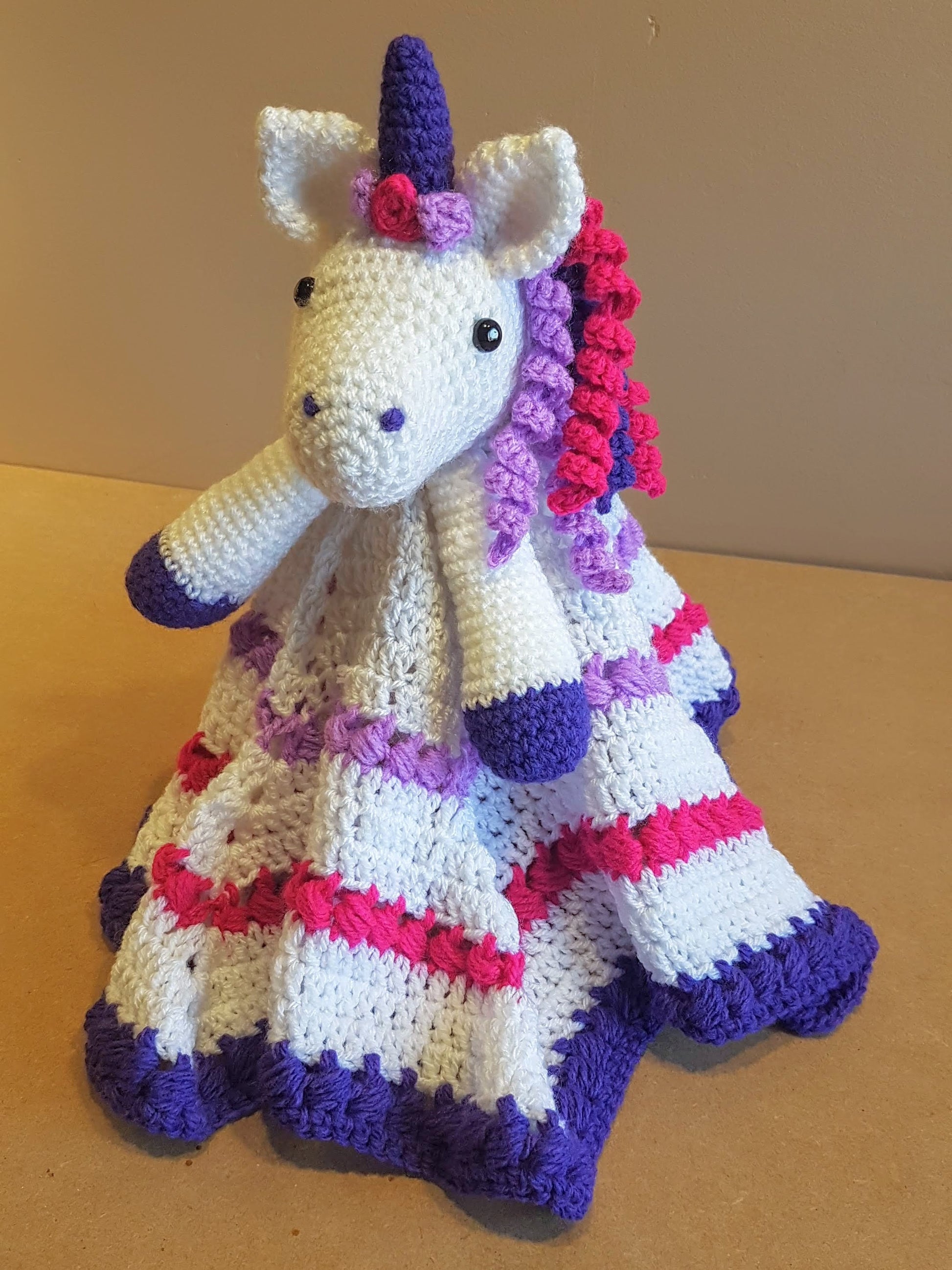 The unicorn lovey was designed to match the baby blanket with a similar pattern.